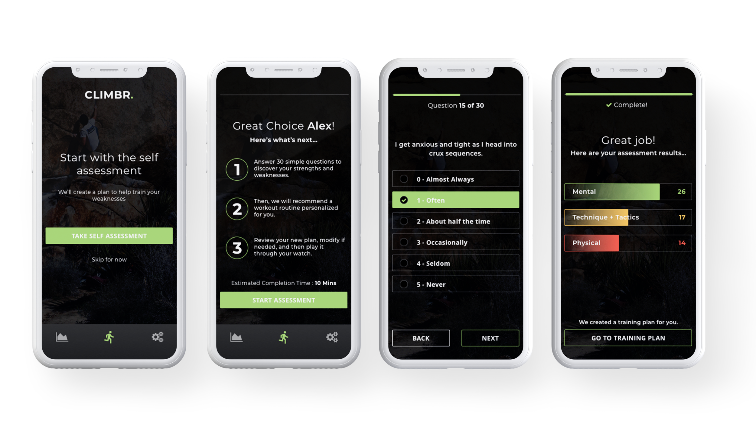Climbers can take a climbing assessment to gauge their current level of mental, technical, and physical strength. Climbr will then create a personalized workout to target weak areas in their climbing. Exercises focusing on improving different areas of climbing, from technique and muscle recovery to fear management.