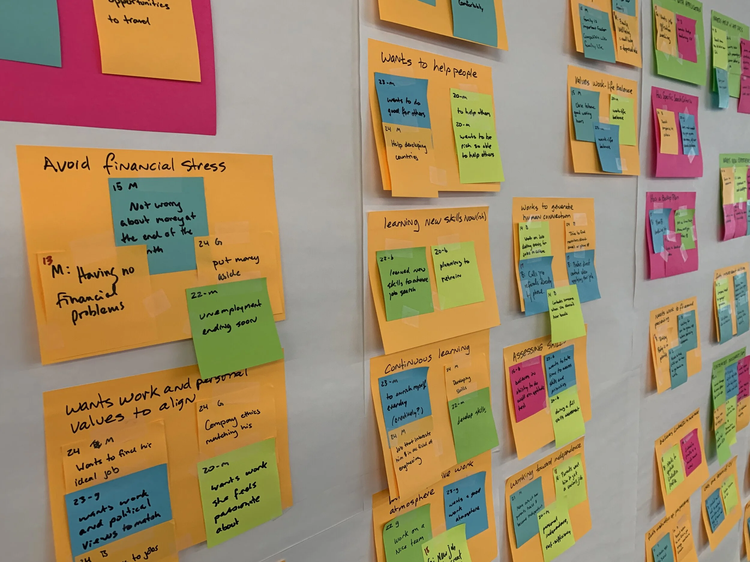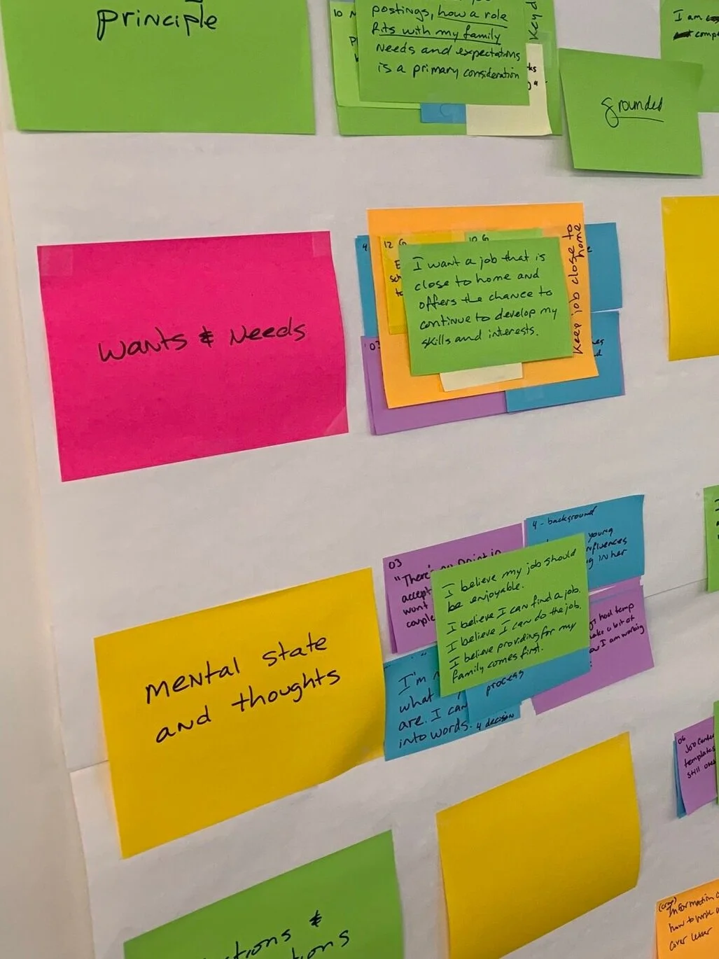We needed to do a deeper dive into the raw data to better understand what motivates users to take action, what behaviors they have when taking action, and what is the goal of each person as it pertains to their job search. We split up and read through each profile writing out statements that describe a motivation, a behavior, or a goal.