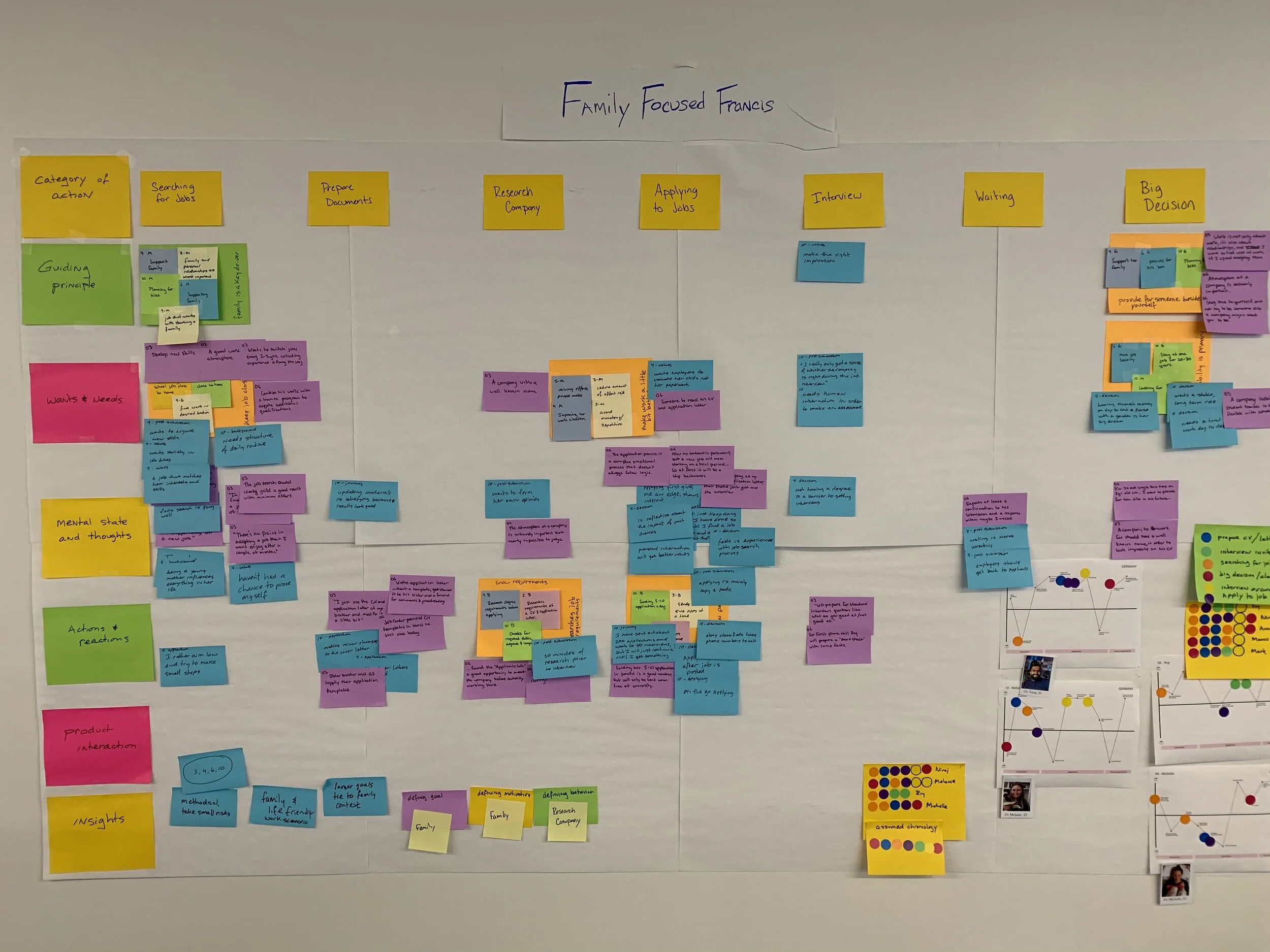 Now that we know their experiences, the actions they take, what they want & need, and their mental state we can look at each step in their journey and try to tease out a guiding principle in which they live their life. This did not necessarily need to be related to their job search, but rather a value in which they use to guide their decisions in life. So we went through each step in the journey and developed a guiding principle so on a deeper level we could understand the core values that guide our user’s decision-making during their job search.
