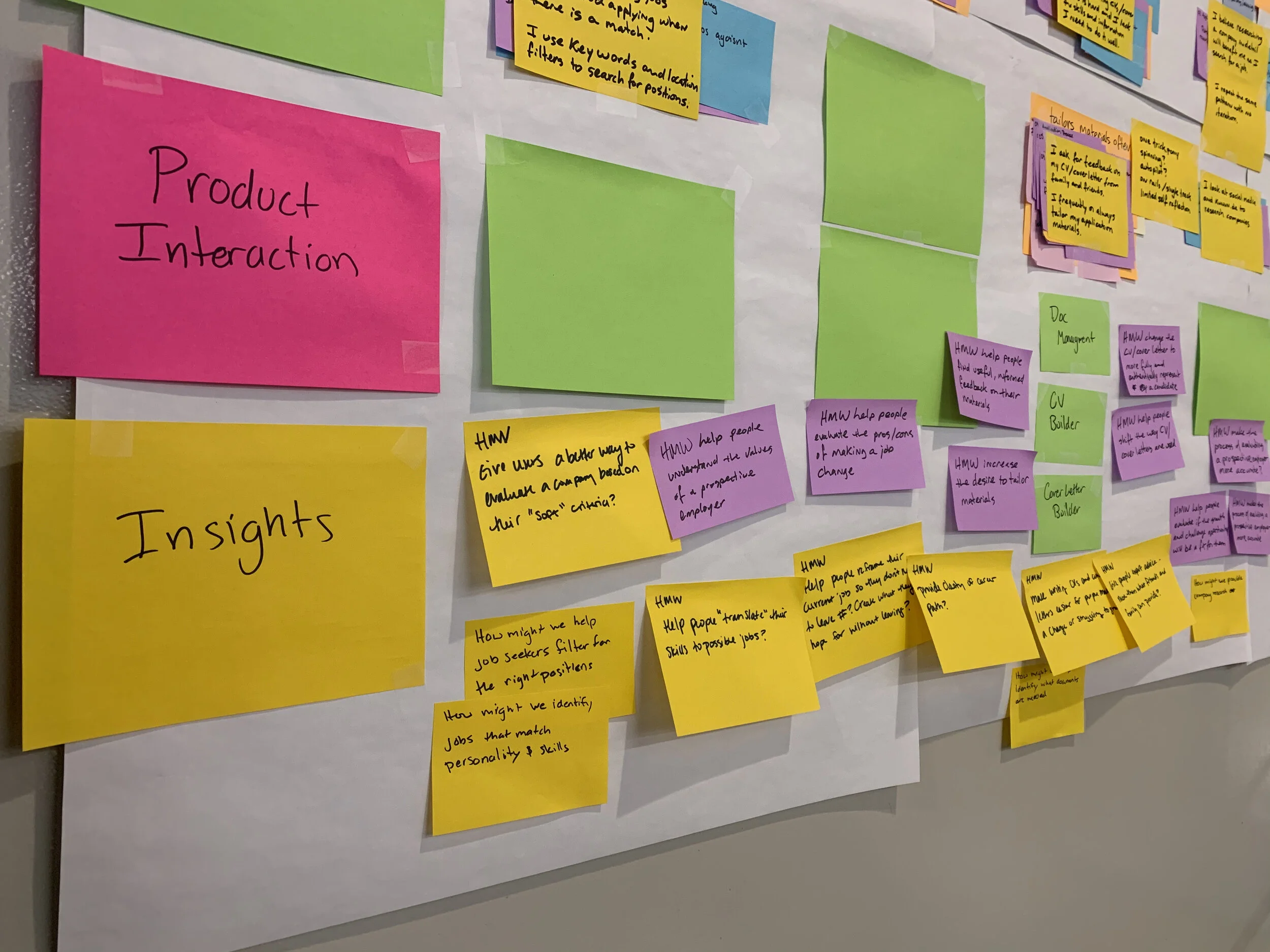 To gather insights we again needed to look at the wants & needs, mental state, and actions job seekers are taking at each step in the journey, but this time we have a better understanding of what guides their decision, through the guiding principle. We looked at each category and asked “what is it those job seekers struggle within this step and how might we help them.” At each step in the journey, we came up with as many “How might we…” statements as we could.