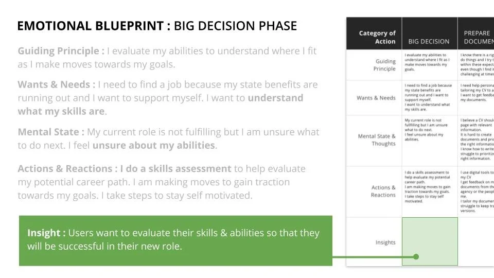 We used the data and evidence we had to create an overarching statement that captures the actions, mental state and needs a job seeker has at this point in their search.