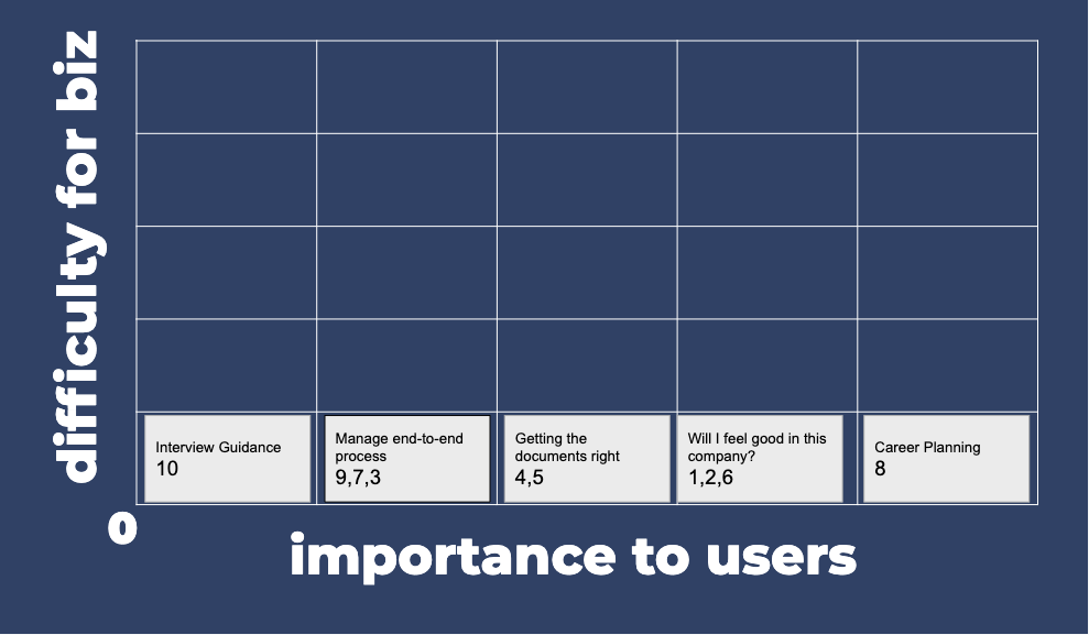 When we were all in agreement on the order of importance to the user, it was time to debate how difficult it would be for the business to implement. Each group came out with something like this.
